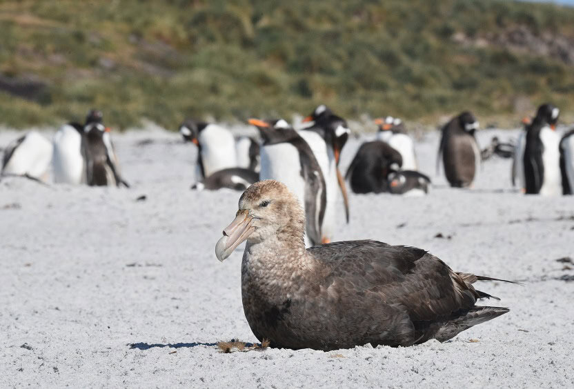 If you are lucky, you might see the Giant Petrel on the sand at North Beach when penguins are present. This is the only place I have seen this pelagic bird on land. The Giant Petrel is an enormous and extremely aggressive bird that will attack and eat other seabirds, including birds larger than itself. They are huge and sometimes mistaken for Albatrosses, but Albatrosses are a third larger.