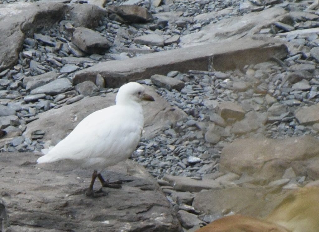 The Snowy Sheathbill is an Antarctic bird that sometimes travels north to the Falkland Islands and other islands and occasionally to the southern tip of South America. The Snowy Sheathbill is the only Antarctic land bird. It is the only Antarctic bird without webbed feet. They are scavengers and eat seal afterbirth, carrion, penguin eggs, chicks, and anything else they can find. Look for them around the Southern Rockhopper colony or around the Sea Lions at South Beach.